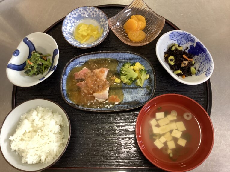 デイサービスセンターわらべが10月16日に提供したお持ち帰り弁当です。メニュー/白ご飯 鶏肉の塩こうじ焼き ブロッコリーサラダ もやしの酢の物 ピーマンの炒め物 ひじきの竹輪煮