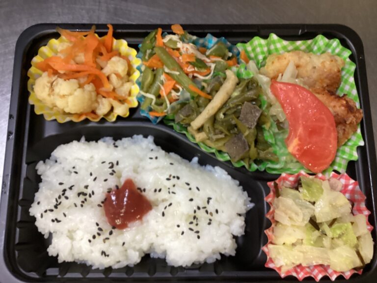 デイサービスセンターわらべが10月16日に提供したお持ち帰り弁当です。メニュー/白ご飯 ご飯 唐揚げ 土佐和え 塩昆布サラダ ピーマンの炒め物 いんげんとカニカマの炒め物