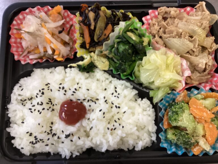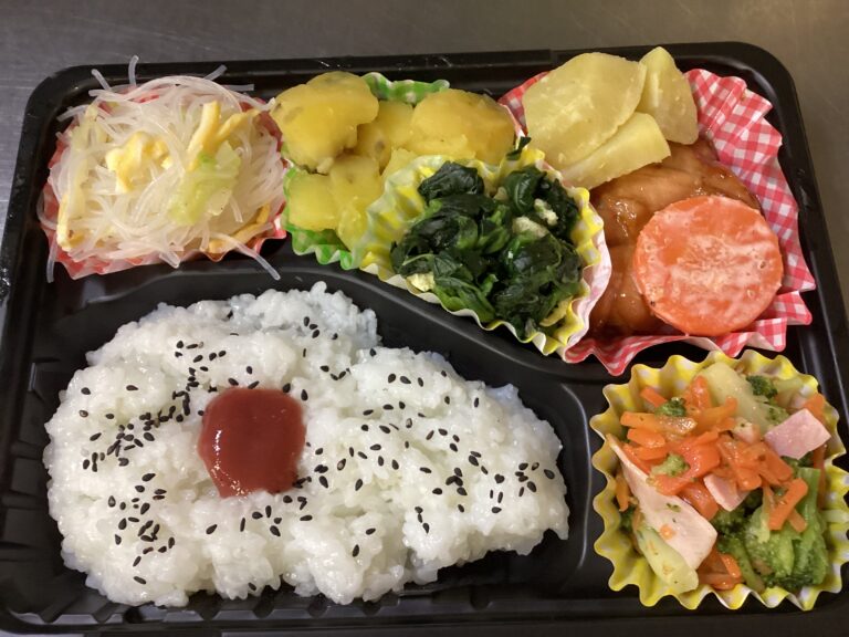 デイサービスセンターわらべが11月3日に提供したお持ち帰り弁当です。メニュー/ご飯 鶏の照り焼き 春雨サラダ ブロッコリーの中華炒め ほうれん草のお浸し さつま芋のレーズン煮