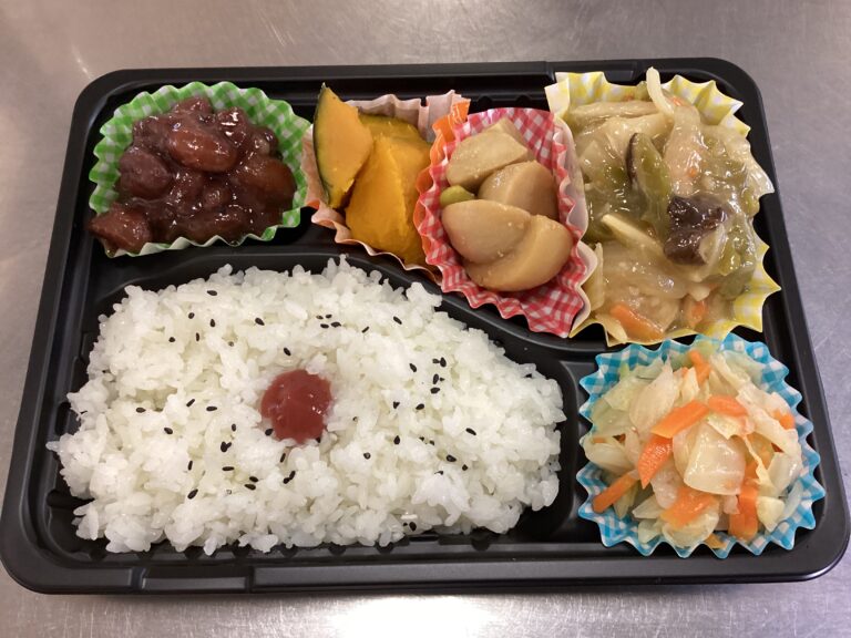 デイサービスセンターわらべが11月4日に提供したお持ち帰り弁当です。メニュー/ご飯 肉だんごと野菜のあんかけ 梅肉和え さといも味噌煮 金時煮豆 かぼちゃの煮物