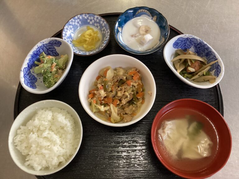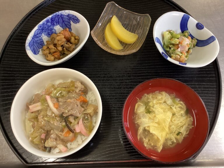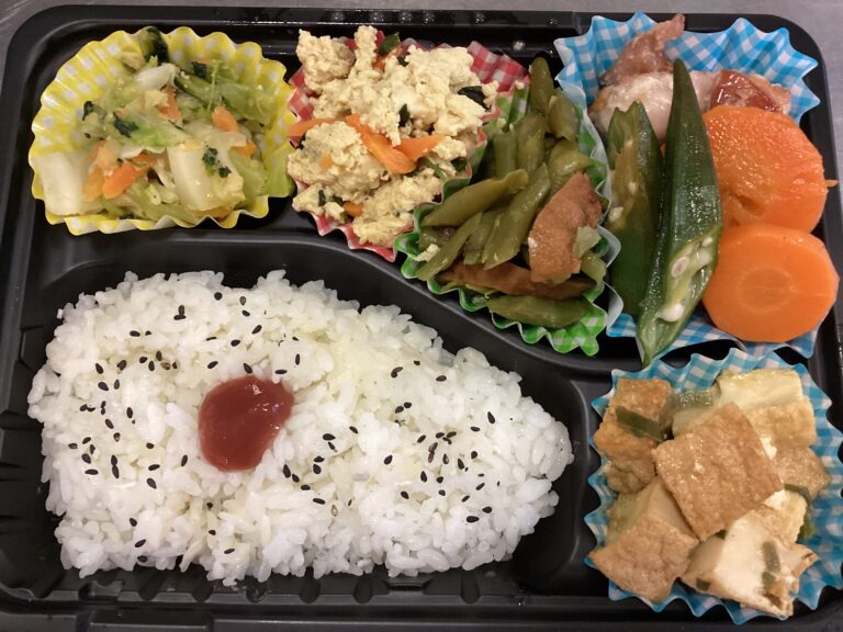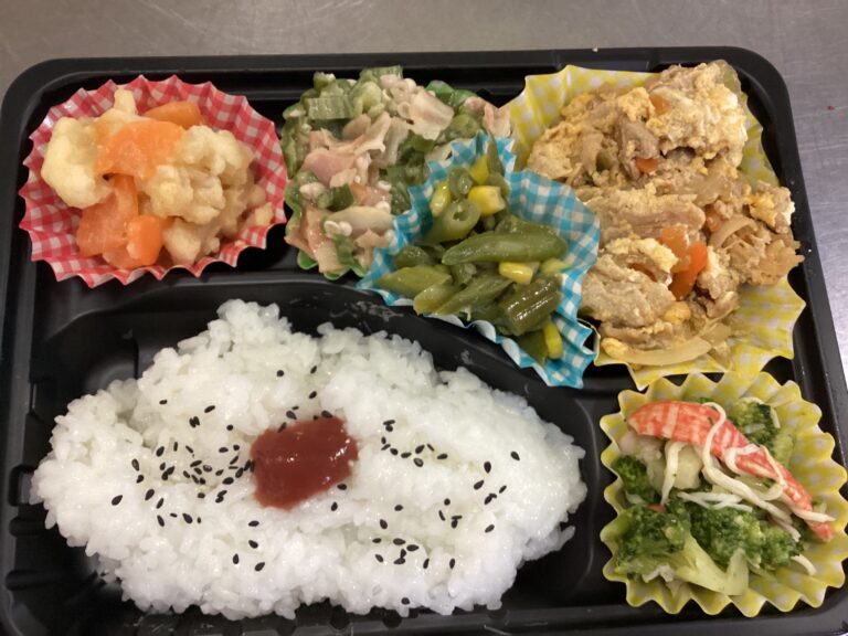 デイサービスセンターわらべが11月24日に提供したお持ち帰り弁当です。メニュー/ご飯 すき玉 カリフラワーの酢みそ和え 和風サラダ ピーマンの炒め物 オクラのベーコン炒め