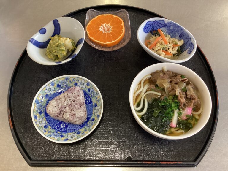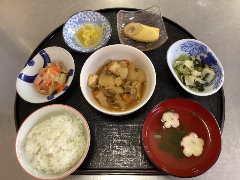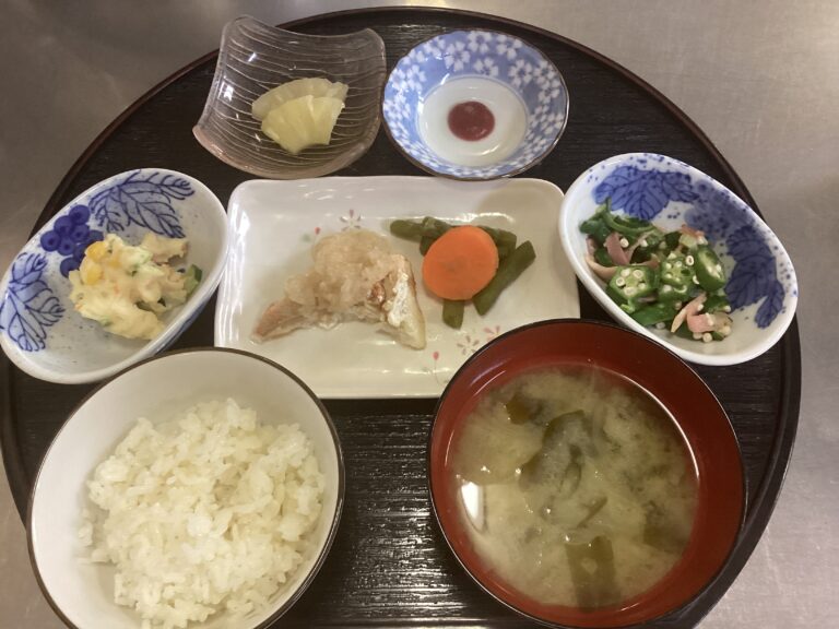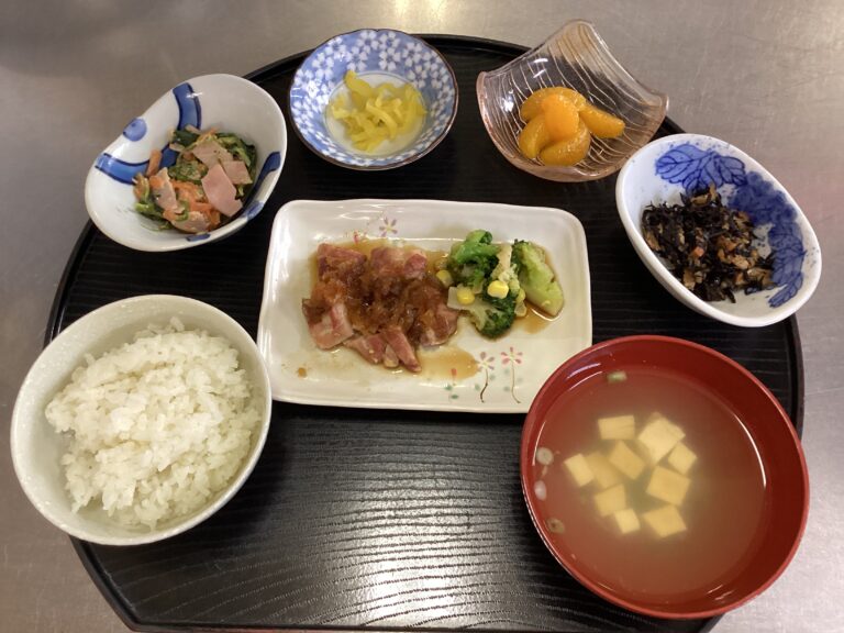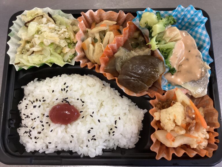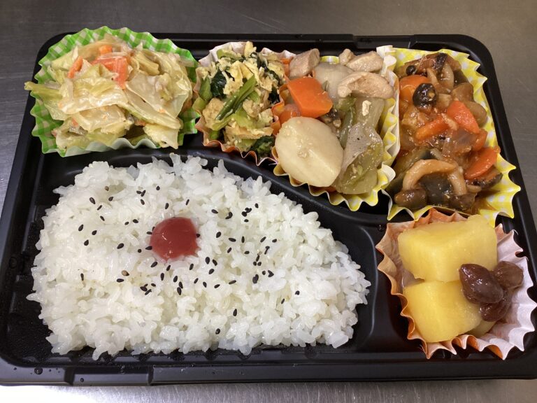 デイサービスセンターわらべが1月15日に提供したお持ち帰り弁当です。メニュー/ご飯 鶏肉の塩麴焼き ブロッコリーサラダ ごま和え 野菜のトマト煮 アゲの煮物