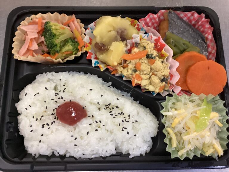 デイサービスセンターわらべが2月2日に提供したお持ち帰り弁当です。メニュー/ご飯 魚の照り焼き 春雨サラダ ブロッコリーの中華炒め 野菜の味噌煮 さつま芋のレモン煮