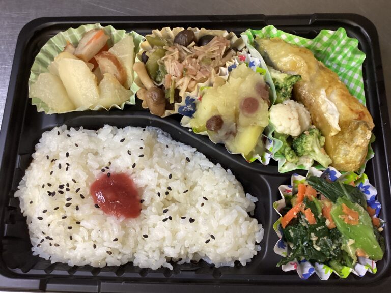 デイサービスセンターわらべが2月4日に提供したお持ち帰り弁当です。メニュー/ご飯 魚のカレームニエル 大根とさつま揚げの煮物 小松菜のピーナッツ和え ピーマンといんげんの炒め物 さつま芋の甘煮