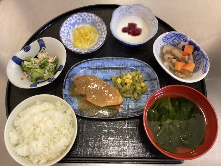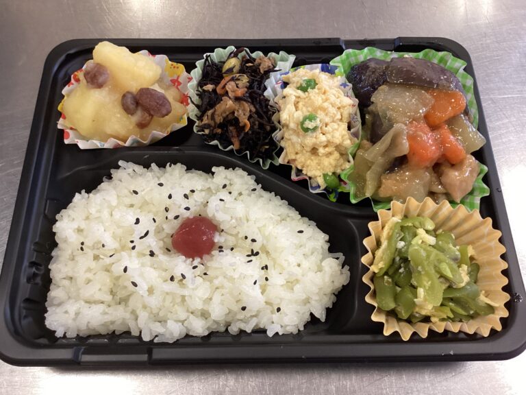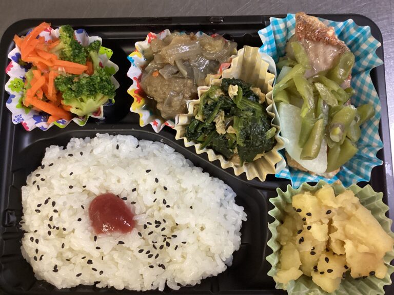 デイサービスセンターわらべが2月16日に提供したお持ち帰り弁当です。メニュー/ご飯 魚の煮付け ブロッコリーのおかか和え さつま芋の金平 ナスの煮物 ほうれん草のおひたし