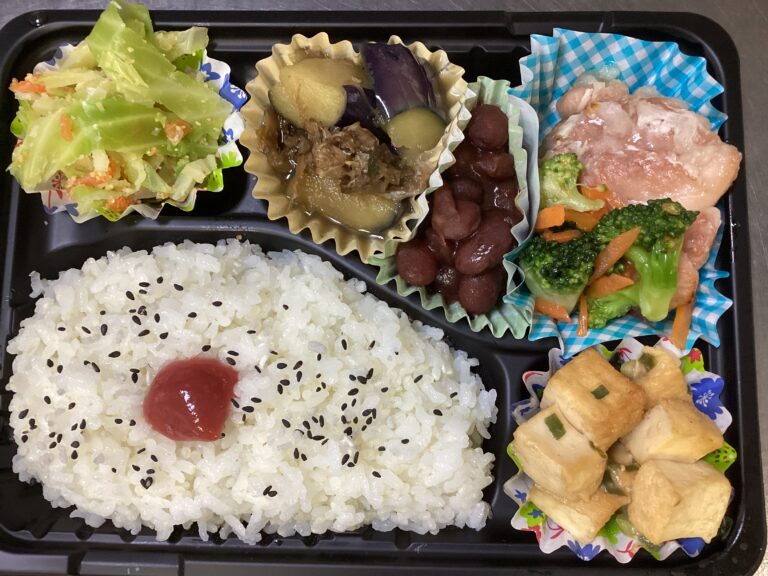 デイサービスセンターわらべが2月18日に提供したお持ち帰り弁当です。メニュー/ご飯 茄子と鶏肉のポン酢炒め 中華和え 豆腐の卵とじ ひじき煮 さつま芋のレモン煮