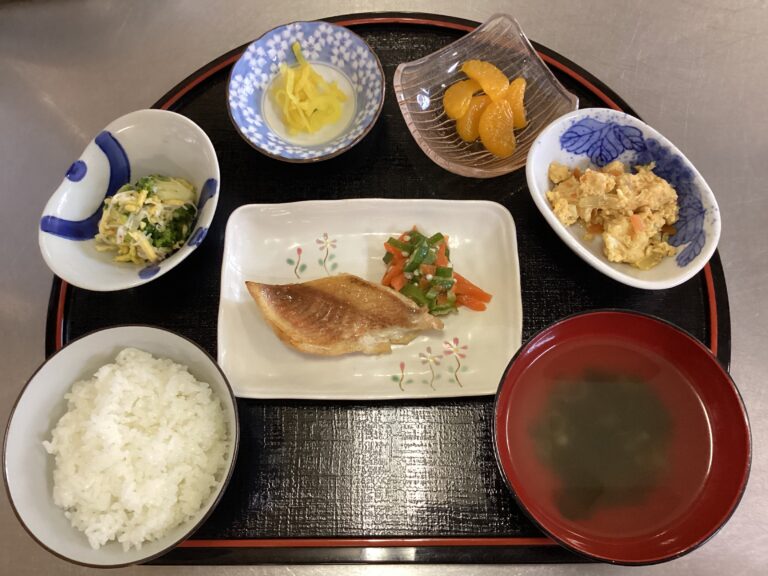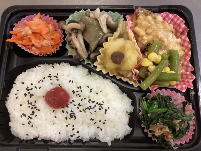 デイサービスセンターわらべが3月19日に提供したお持ち帰り弁当です。メニュー/ご飯 魚の味噌チーズ焼き お浸し 人参サラダ 茄子としめじの煮物 さつま芋のレーズン煮