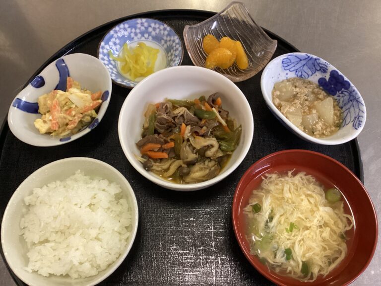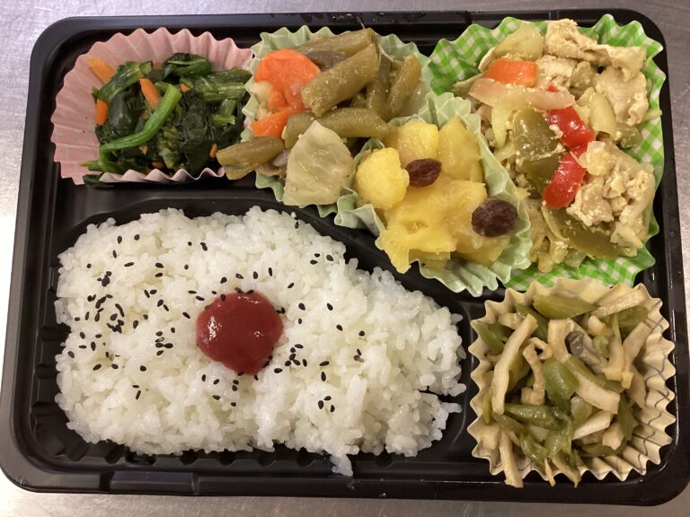 デイサービスセンターわらべが3月30日に提供したお持ち帰り弁当です。メニュー/ご飯 豚肉のカレー炒め インゲンの炒め煮 お浸し さつま芋のレモン煮 いんげんと玉ねぎの煮物