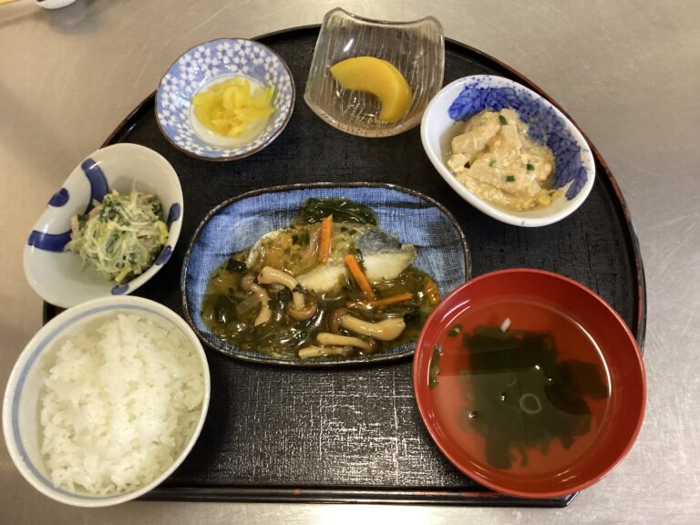 デイサービスセンターわらべが4月13日に提供したお持ち帰り弁当です。メニュー/ごはん 茄子と鶏肉のポン酢炒め じゃがいものそぼろ煮 小松菜の玉子とじ インゲンと竹輪の煮物 煮豆