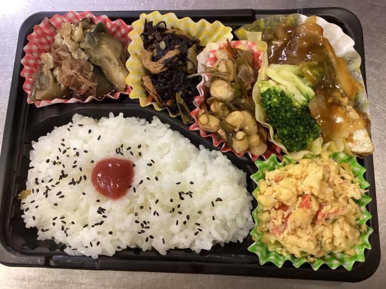 デイサービスセンターわらべが4月21日に提供したお持ち帰り弁当です。メニュー/ごはん 魚のマスタード焼き 茄子の含め煮 ささみの胡麻和え ひじき煮 あん団子