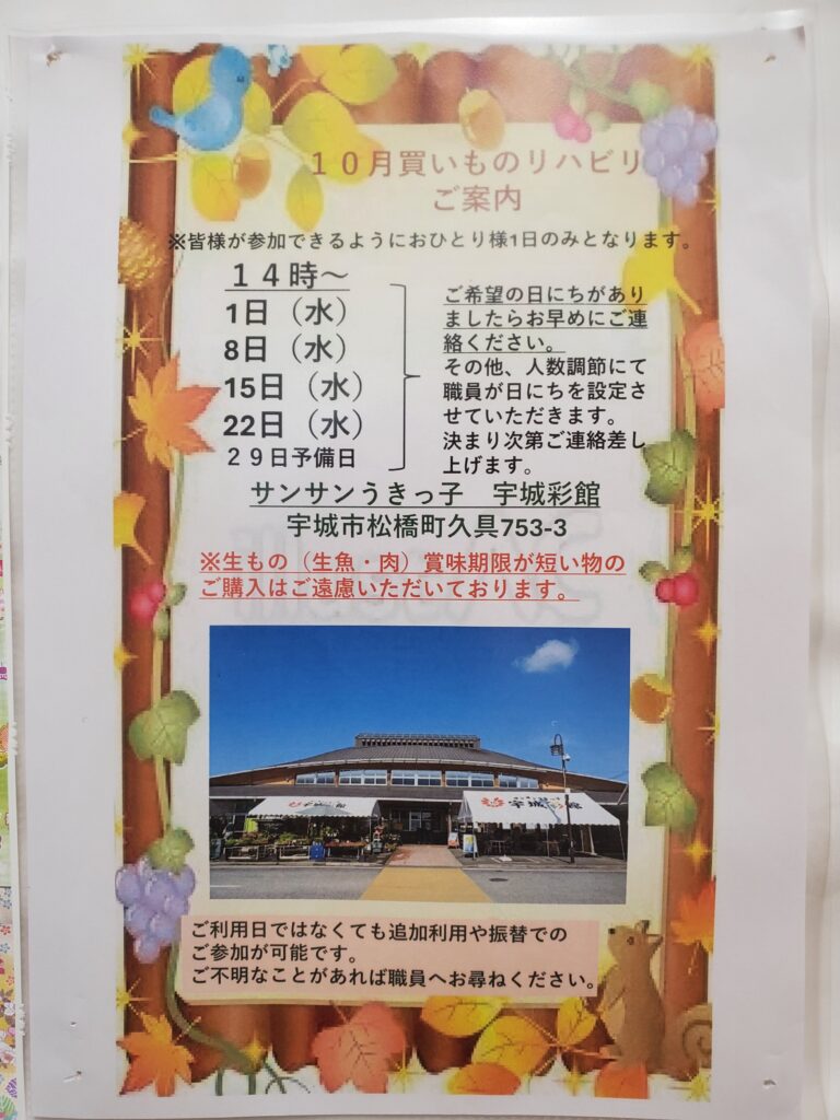 10月は1日、8日、15日、22日に「サンサンうきっ子宇城彩館」で買い物リハを実施します。参加される方の運動機能と認知機能の改善を目的として実施します。その日がいつもの利用日でなくても、追加や振替での利用ができます。