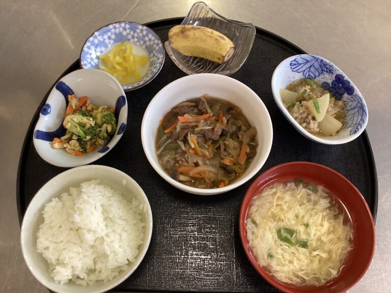 デイサービスセンターわらべが10月8日に提供した昼食です。メニュー/白ご飯 牛肉ときのこの炒め物 大根のそぼろ煮 彩りサラダ かきたま汁 バナナ
