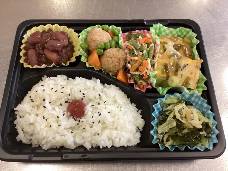 デイサービスセンターわらべが10月8日に提供したお持ち帰り弁当です。メニュー/白ご飯 かに玉 胡麻和え 肉団子の煮物 中華風サラダ 金時煮豆