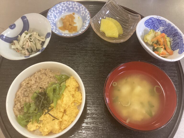 デイサービスセンターわらべが10月24日に提供した昼食です。メニュー/三色丼 ブロッコリーの中華炒め 大根サラダ けんちん汁 パイン缶