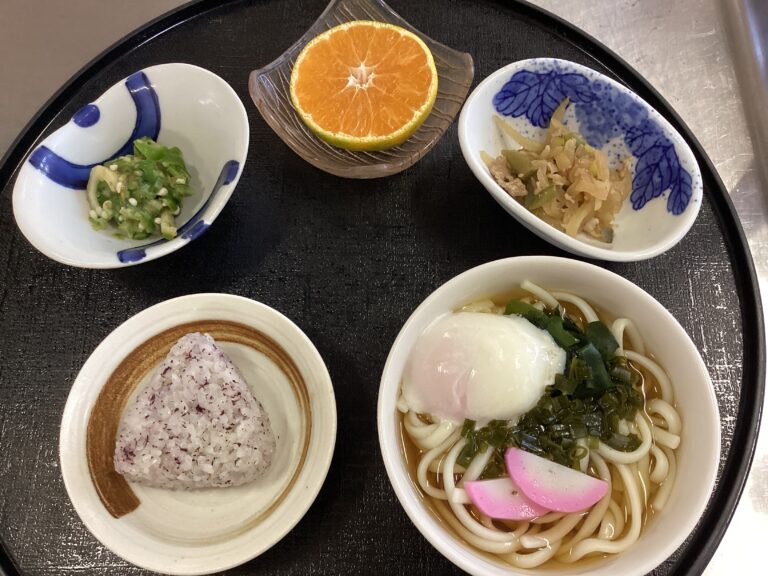 デイサービスセンターわらべが11月6日に提供した昼食です。メニュー/おにぎり 月見うどん おかか和え 大根金平 みかん
