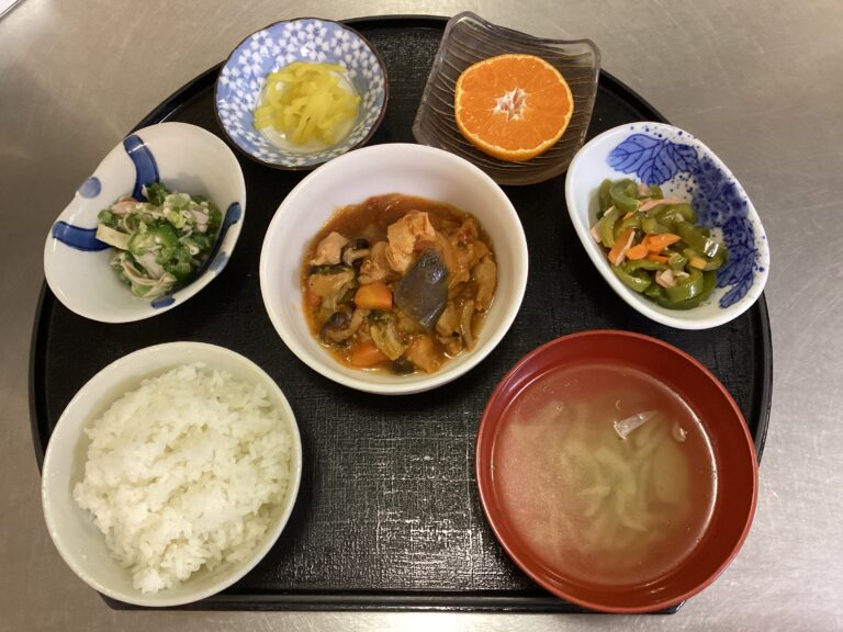 デイサービスセンターわらべが12月3日に提供した昼食です。メニュー/白ご飯 鶏肉のトマト煮 ピーマンソテー オクラのサラダ オニオンスープ みかん