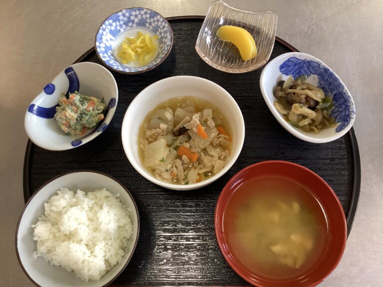 デイサービスセンターわらべが12月16日に提供した昼食です。メニュー/白ご飯 豚バラ大根 白和え キノコ炒め 味噌汁 黄桃缶