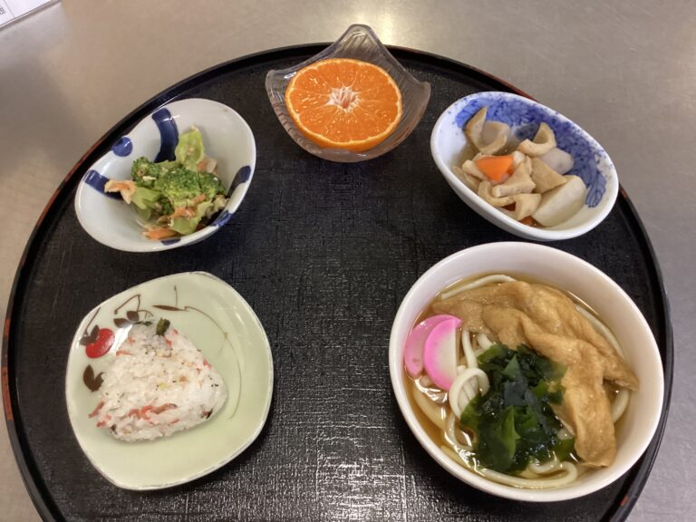 デイサービスセンターわらべが12月17日に提供した昼食です。メニュー/きつねうどん おにぎり 里芋の煮物 ささみのサラダ みかん