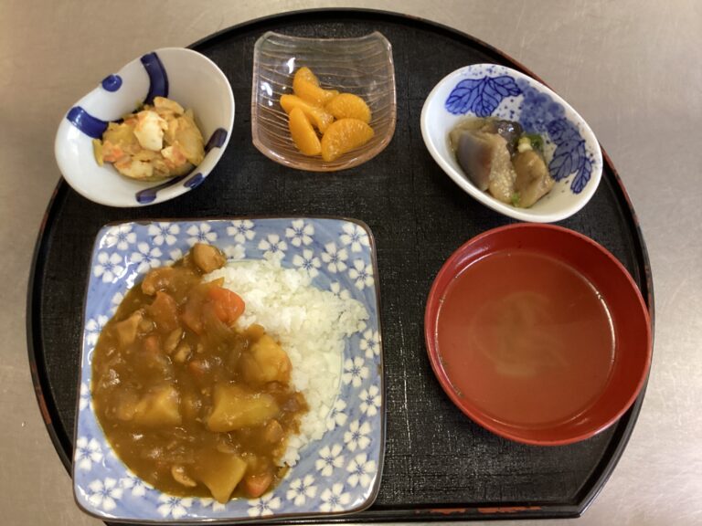 デイサービスセンターわらべが12月19日に提供した昼食です。メニュー/チキンカレー 茄子の生姜煮 卵サラダ コンソメスープ みかん缶