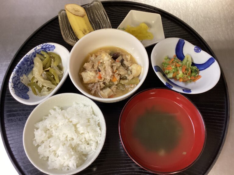 デイサービスセンターわらべが12月24日に提供した昼食です。メニュー/白ご飯 家常豆腐 からし和え ピーマンのじゃこ炒め わかめスープ バナナ