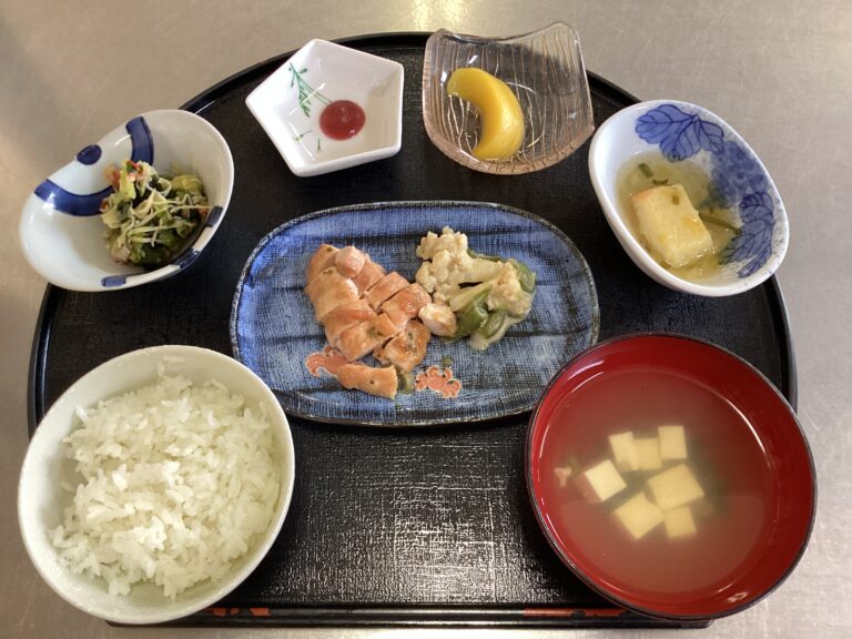 デイサービスセンターわらべが12月26日に提供した昼食です。メニュー/白ご飯 鶏肉の香味焼き 揚げ出し豆腐 海藻サラダ すまし汁 黄桃缶