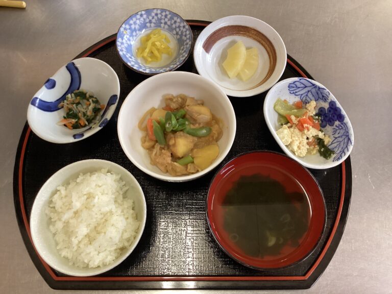 デイサービスセンターわらべが2月2日に提供した昼食です。メニュー/白ご飯 肉じゃが 豆腐チャンプルー からし和え わかめスープ パイン缶