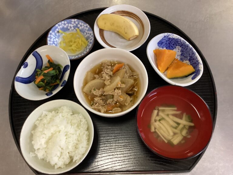 デイサービスセンターわらべが4月27日に提供した昼食です。メニュー/ごはん 豚ばら大根 南瓜煮 ほうれん草のお浸し 清まし汁 バナナ 漬物