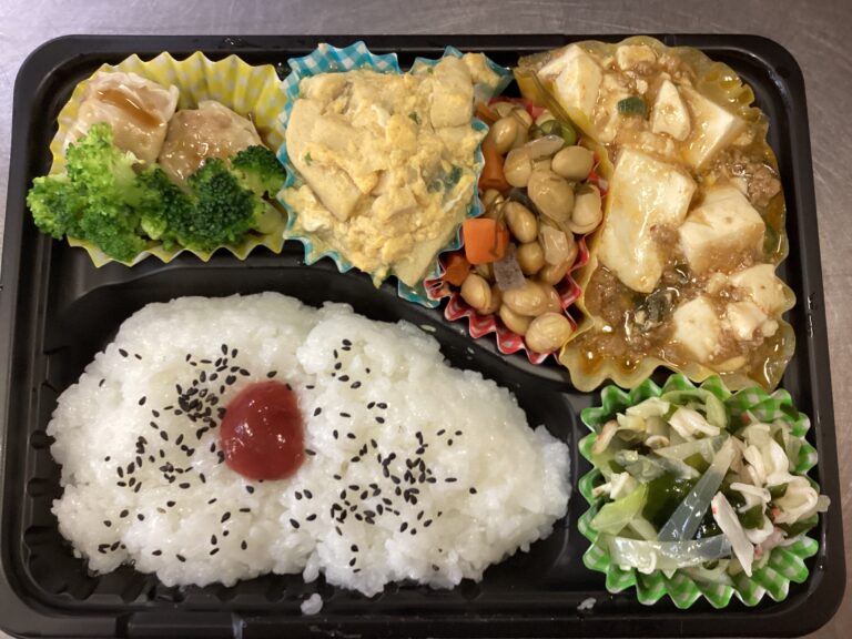 デイサービスセンターわらべが4月27日に提供したお持ち帰り弁当です。メニュー/ごはん 麻婆豆腐 焼売 海藻サラダ 五目豆 高野豆腐の卵炒め